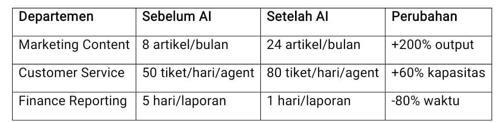1. Lihat AI sebagai investasi produktivitas, ROI dari adopsi AI datang dari peningkatan output, bukan pengurangan headcount. Frame-nya adalah “growth enabler”, bukan “cost cutter”.
